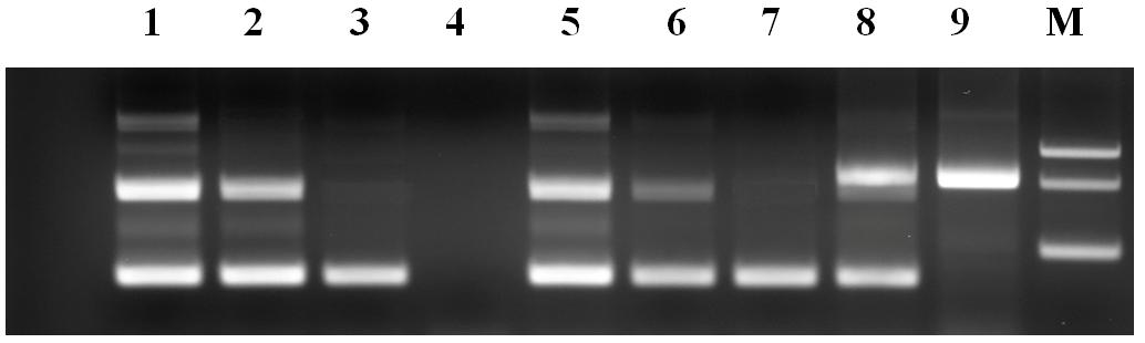 - Lane M: Molecular weight markers, 848 bp, 630 bp, 333 bp
